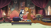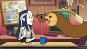 Every bit a knowledgeable historian during her time at the Emperor's Coven, Lilith doubted King's claims that he was once a despotic ruler, claiming that prior to Emperor Belos, demons did not have a unified ruler. All the same, determined to prove Lilith and Hooty incorrect, King brings Luz and Lilith'due south staffs into the room and announces that they are going to his castle. Luz agrees to play along, as does Lilith, to show Rex that he is incorrect. Lilith invites Hooty, who promptly removes himself from the door and places himself in a portable backpack, much to the horror of everyone else. However, Lilith's interest is piqued when the group discover a castle on an uncharted isle. Exploring the castle only piques Lilith's interest even further, and she even begins to believe King's claims. However, she and the group are attacked by Jean-Luc, forcing her, Hooty, Luz, and King to flee while Eda distracts the creature. Afterward realizing that he was never the tyrant he believed himself to be, King becomes emotional and runs off, forcing the group to split up and notice him. In one case King is found, Lilith and Hooty are tasked with attacking Jean-Luc using Eda'south potions, while Luz, Eda, and King detect their way up the top of the tower. While King was having important revelations about his by, Lilith takes pictures of some of the wall carvings.[12]